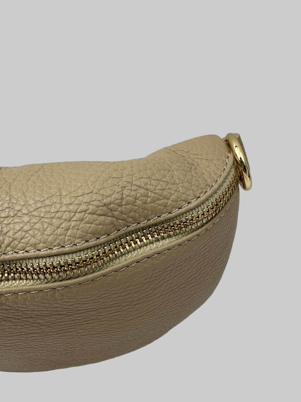En rymlig midjeväska i mjukt läder. Väskan har dragkedja fram. Reglerbar midjerem.