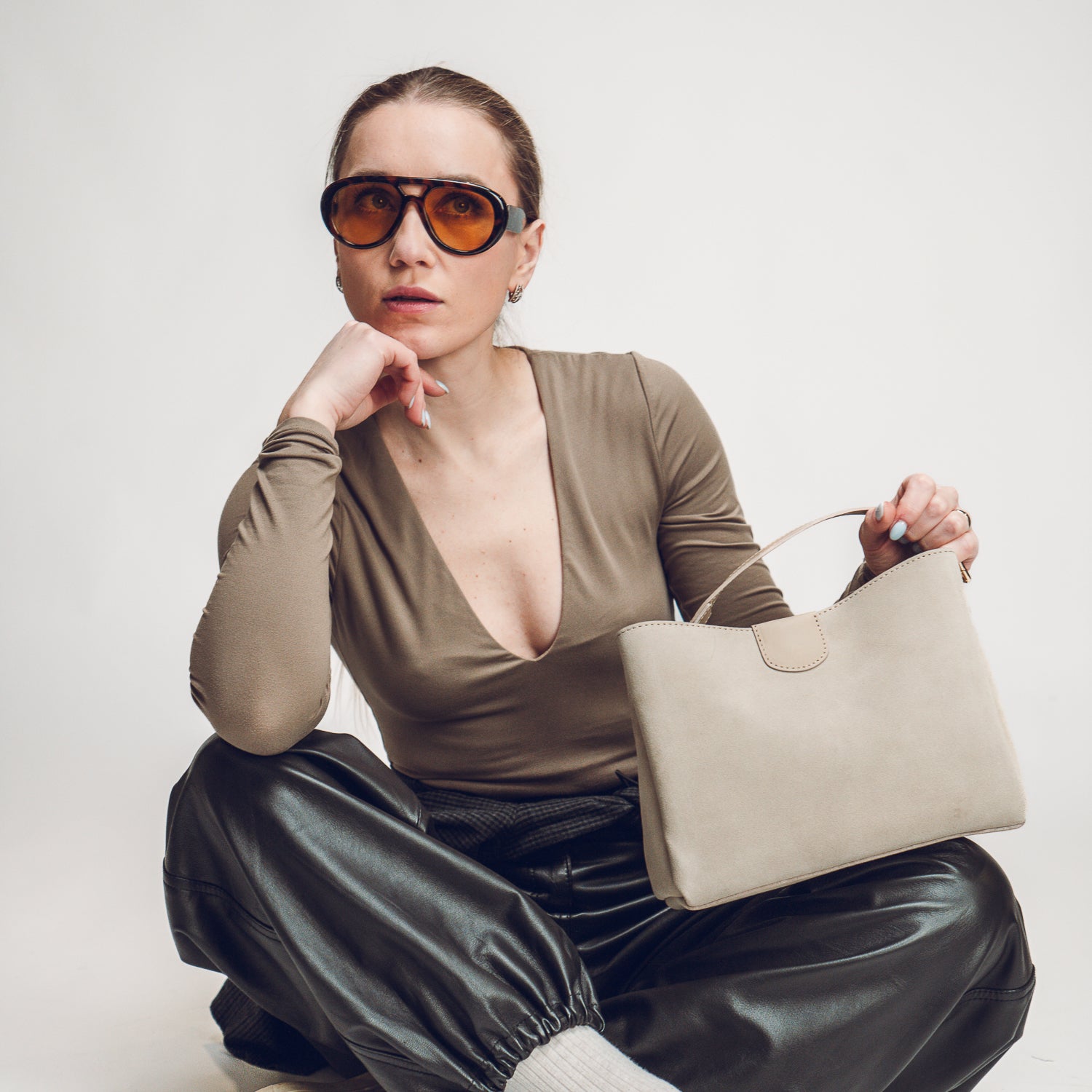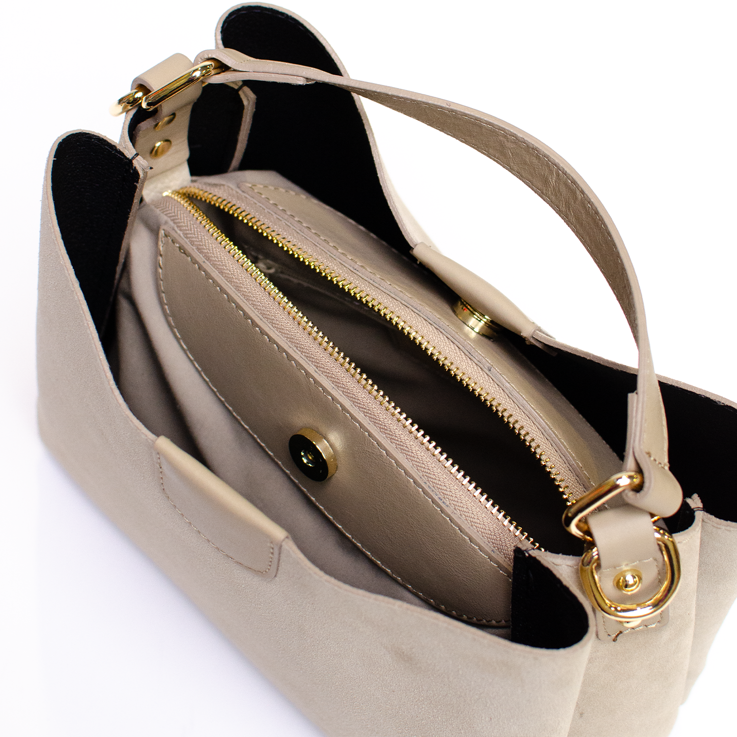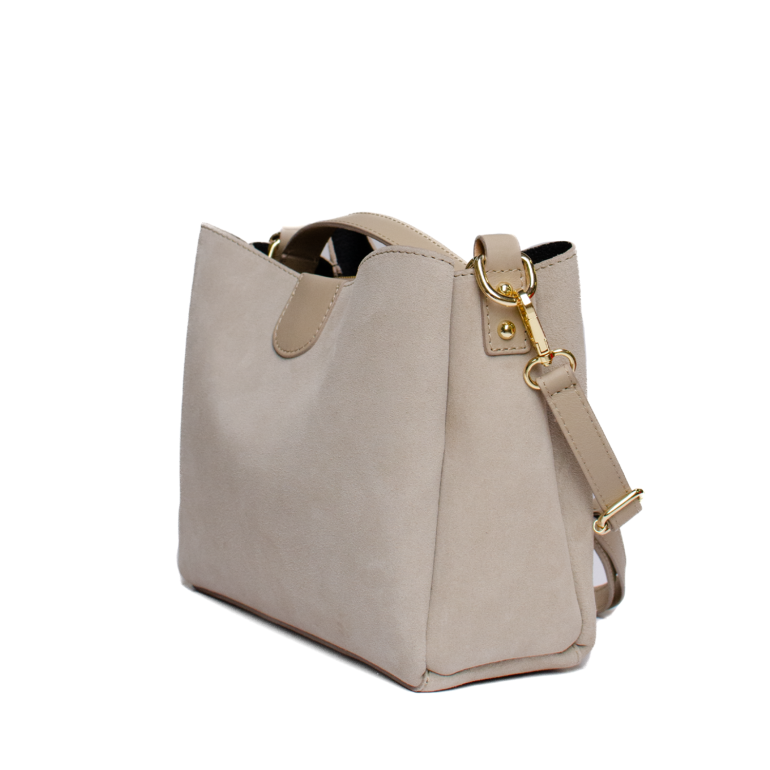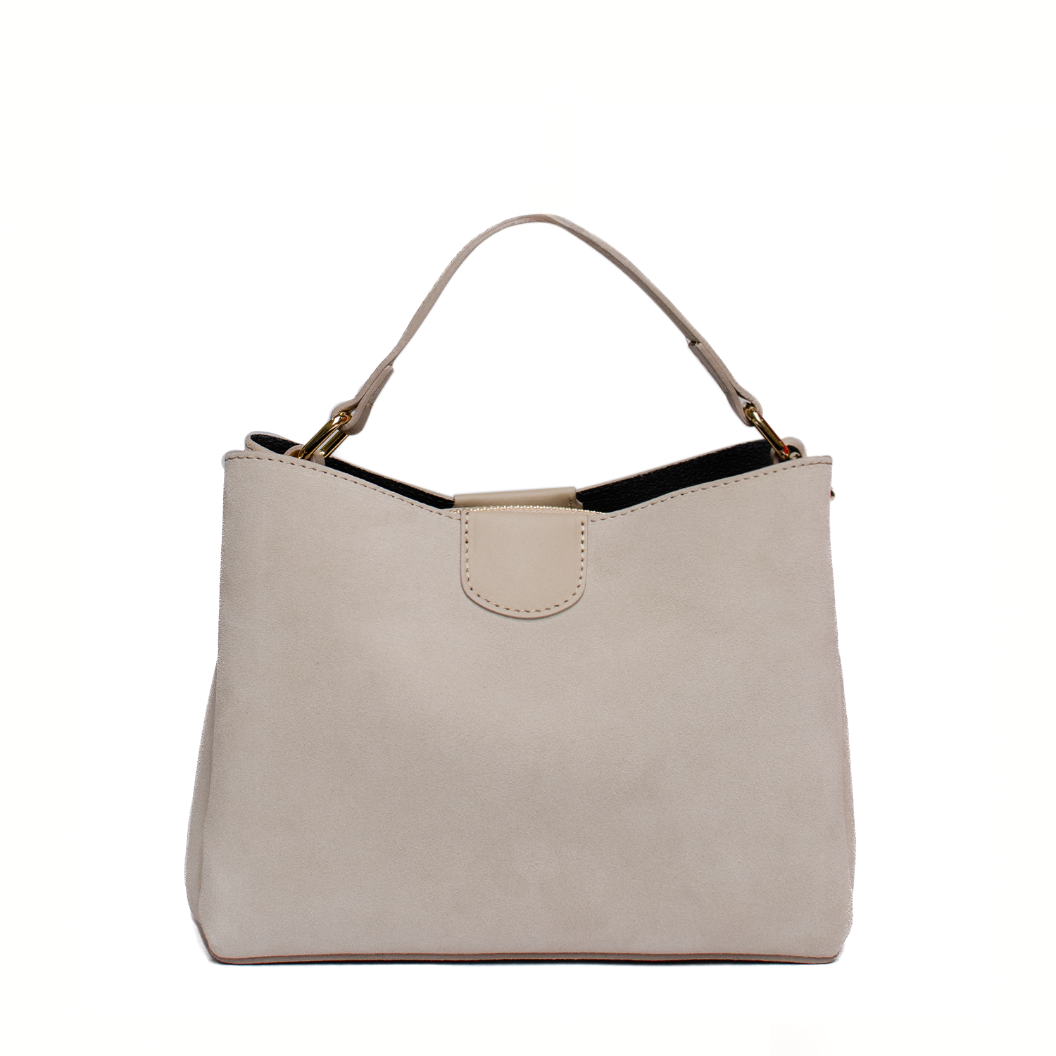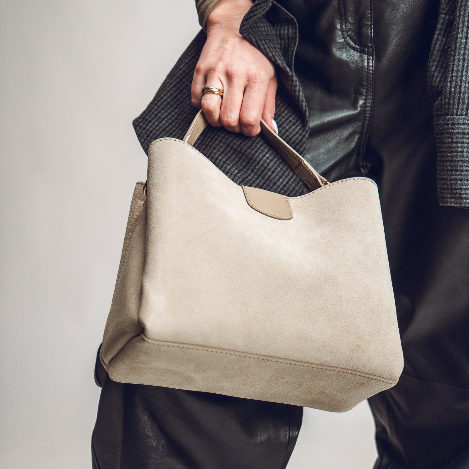 Väska i äkta mocka och lyxigt nappa-läder. Väskan har två rymliga huvudfack, separerade av en praktisk ficka med dragkedja. Bär den i hand med de stilrena handtagen eller använd den avtagbara axelremmen för en mer avslappnad look.