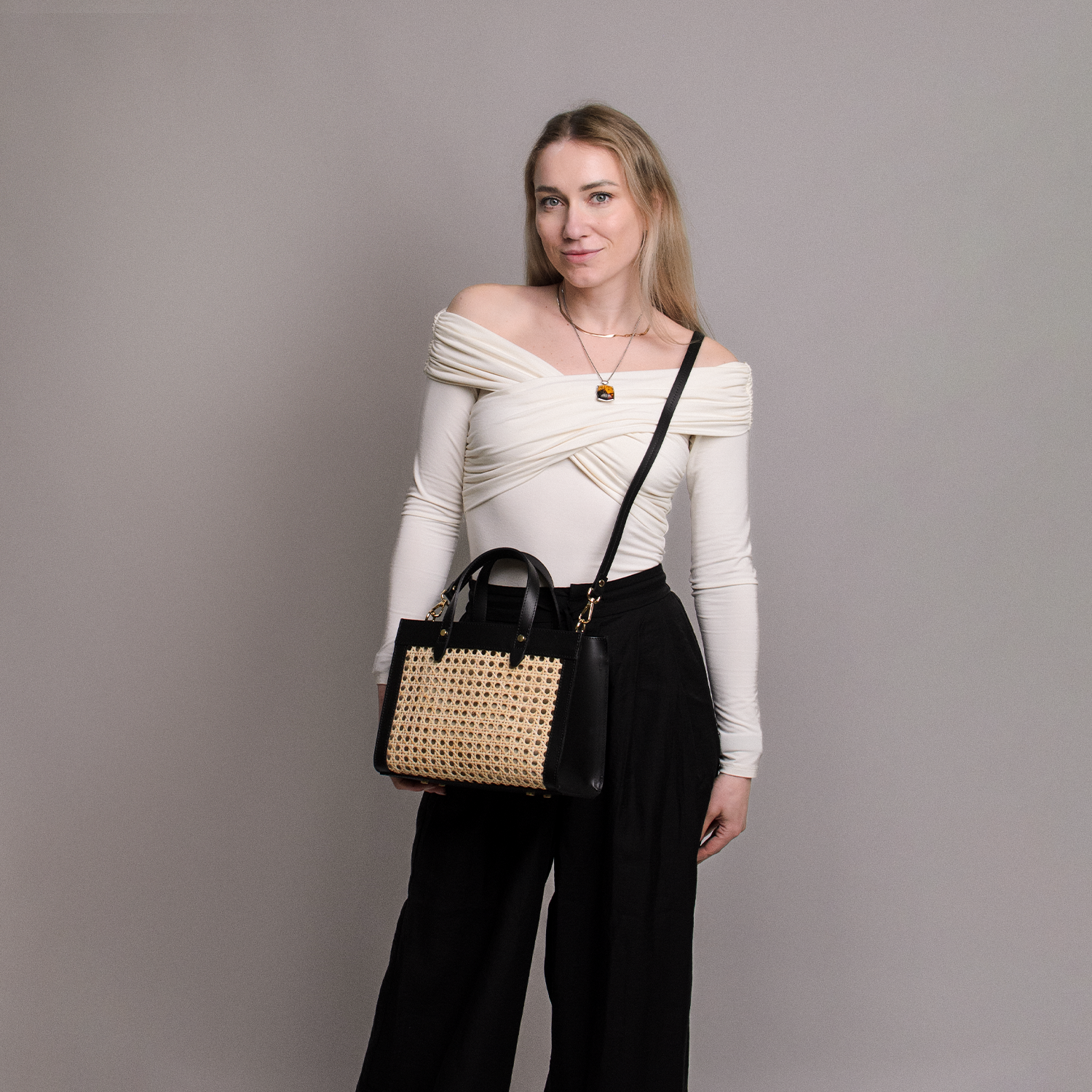 Den här toteväskan är tillverkad av naturlig rotting med detaljer i koläder. Den har en dubbel innerficka samt en innerficka med dragkedja. Väskan kan bäras i handen, över axeln eller crossbody.