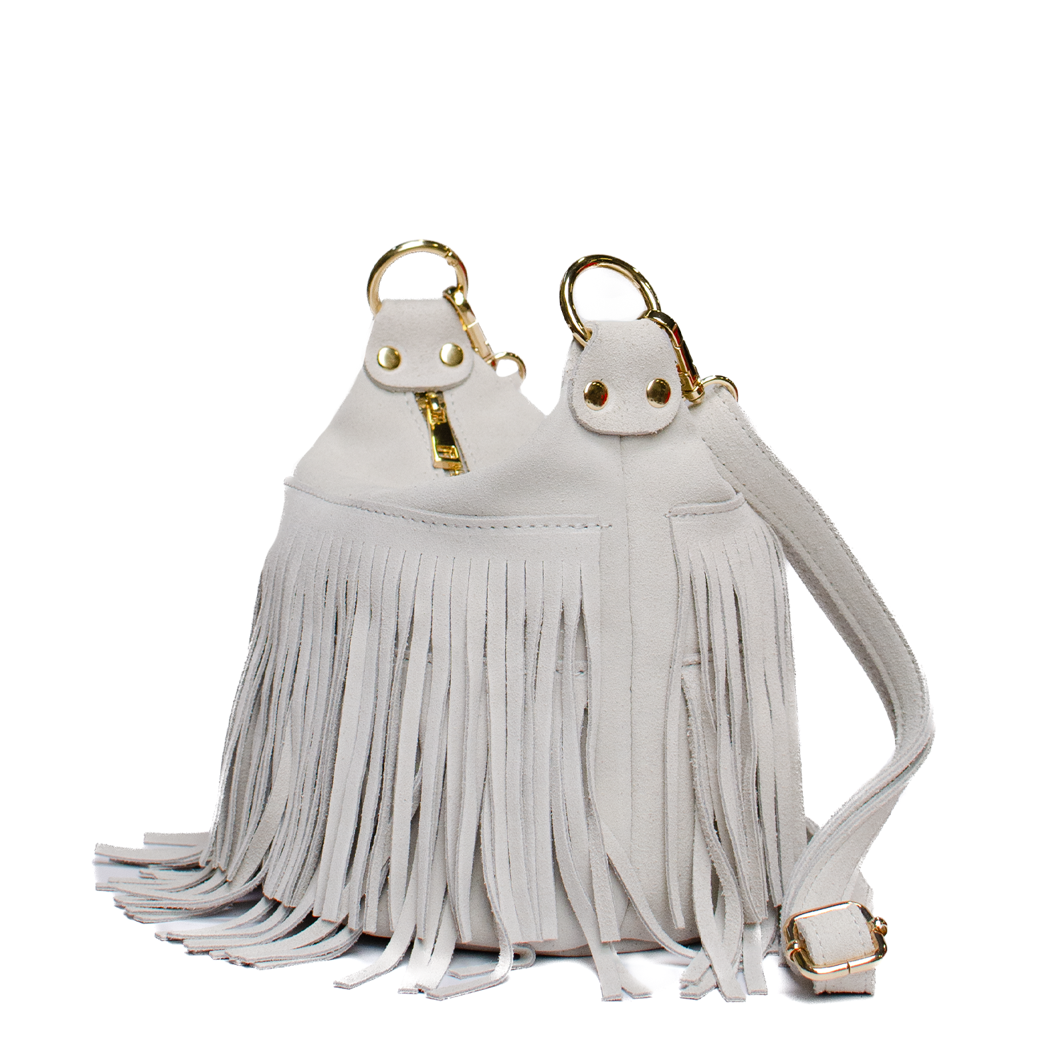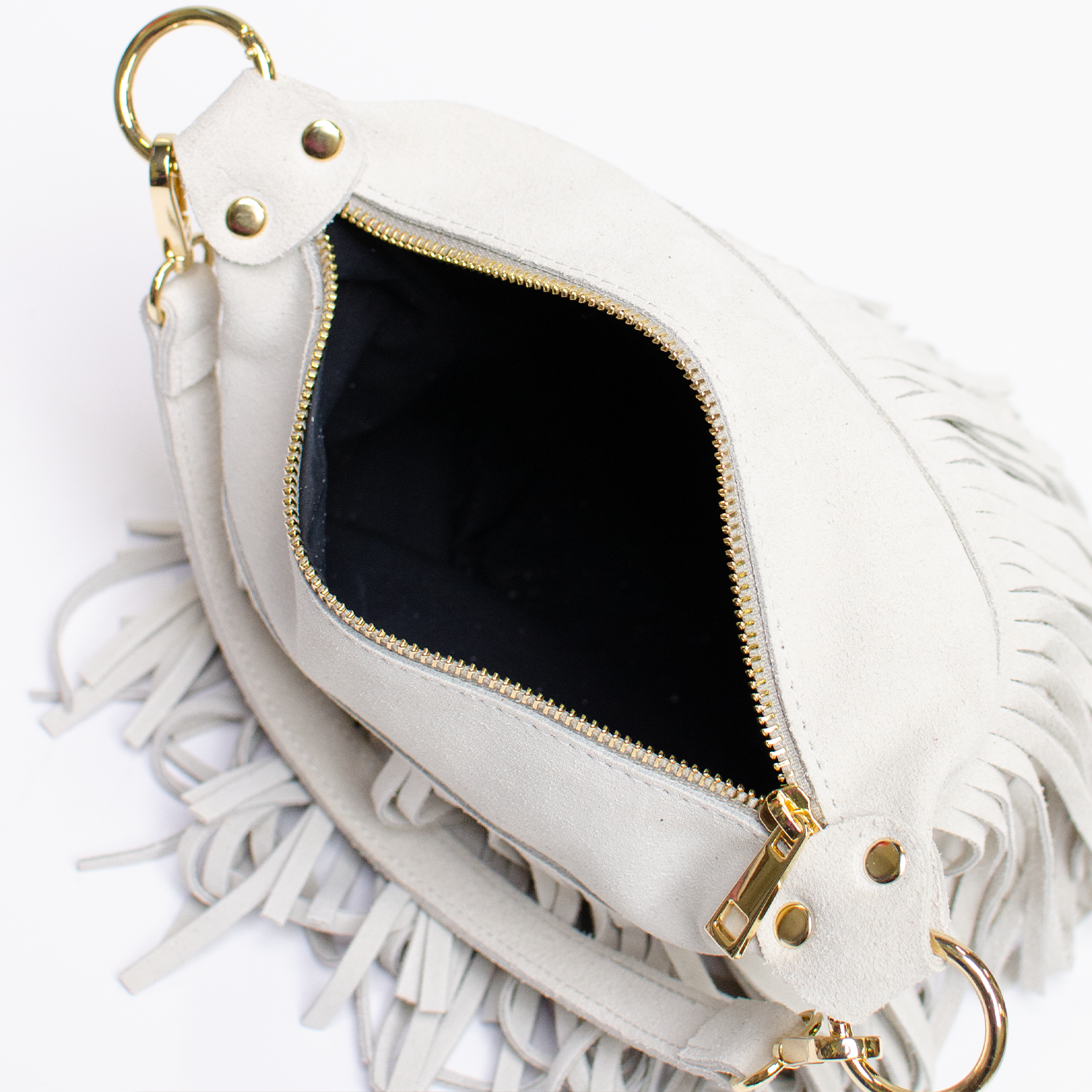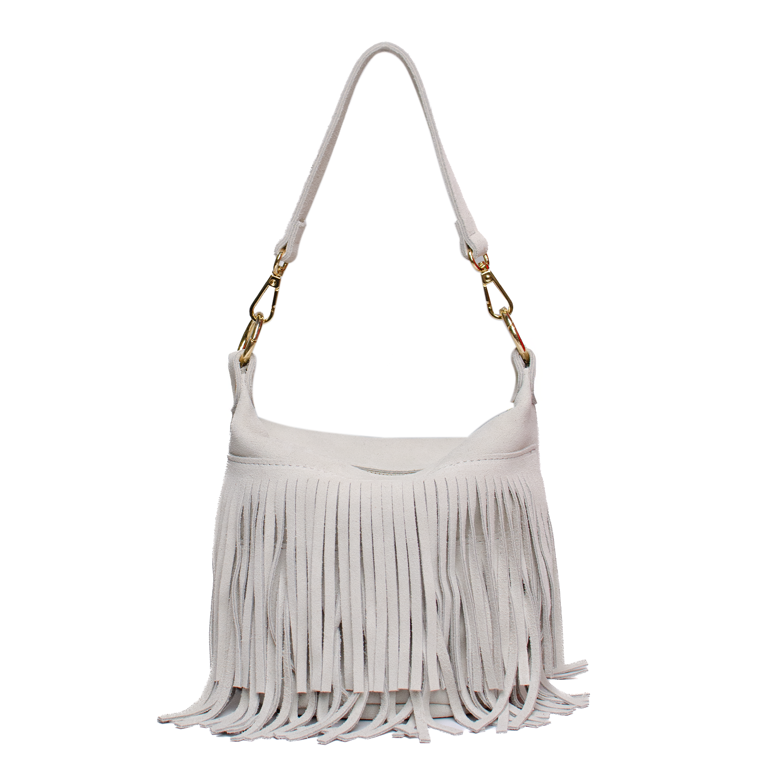 Väska med fransar, kort handtag och lång axelrem.