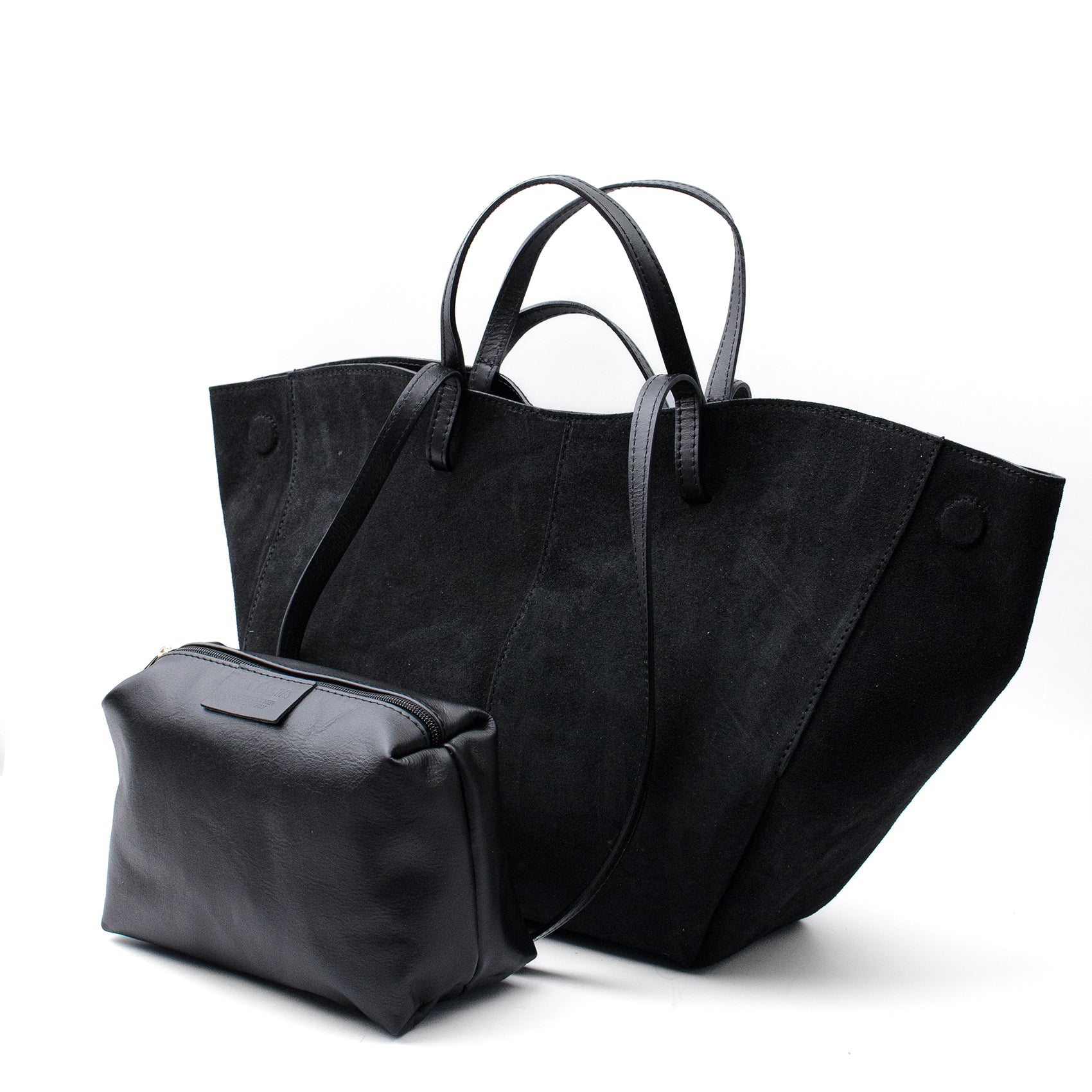 Tack vare magnetknappar i sidorna kan väskan enkelt göras mindre och anpassas efter behov. Utrustad med två handtag och två längre axelremmar för flexibel bärkomfort. På insidan finns en separat liten necessär i äkta läder som håller ordning på dina mindre saker. En elegant och praktisk väska för både jobb och vardag.