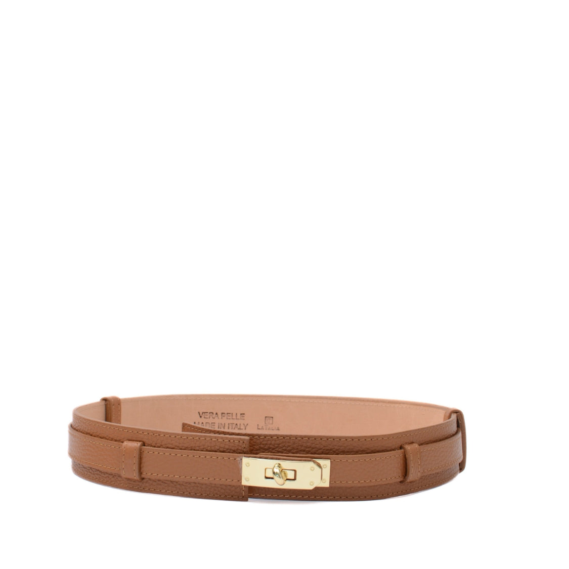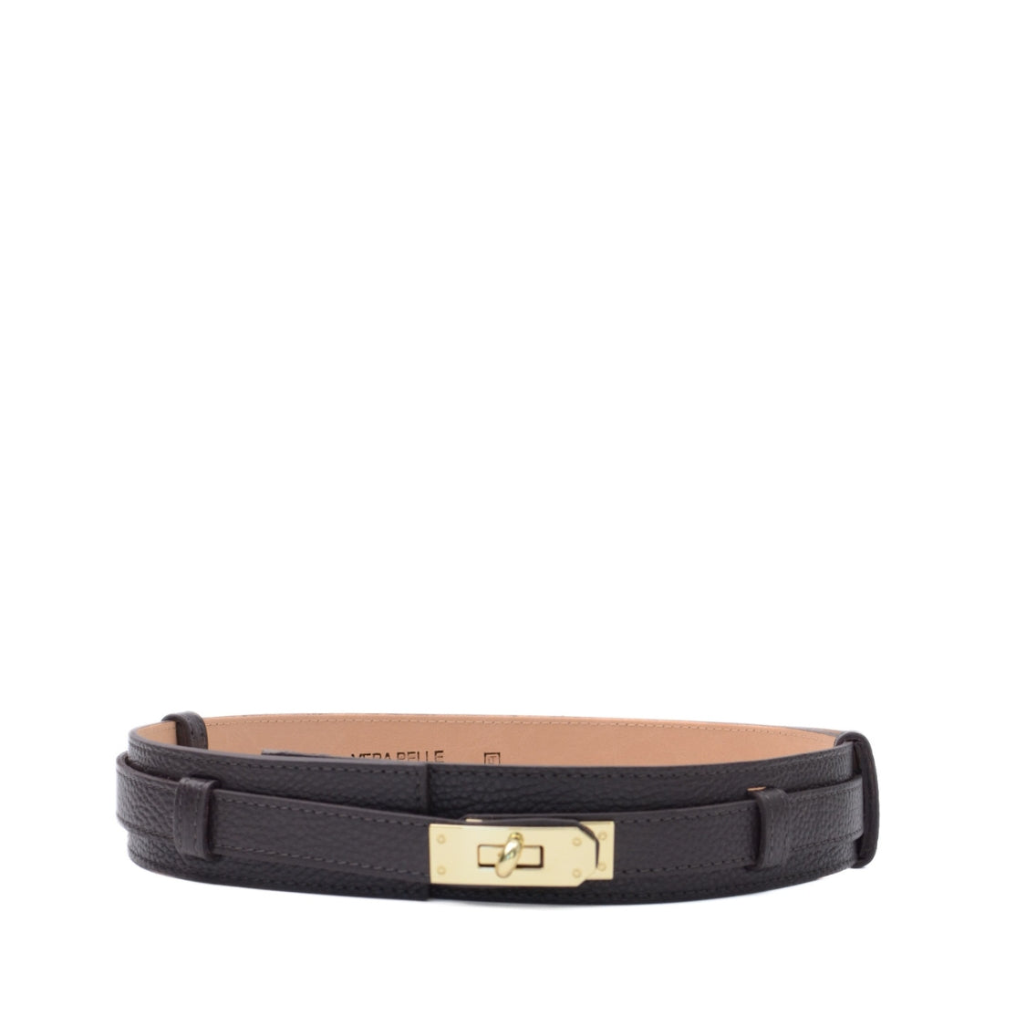 Detta stilrena bälte är tillverkat av äkta läder och har en exklusiv känsla. Med sin justerbara längd från 50 cm till 90 cm passar det perfekt för olika midjemått. Det gyllene vridlåset ger en sofistikerad touch och gör bältet både praktiskt och elegant. Perfekt för att komplettera din outfit med en tidlös och lyxig detalj.