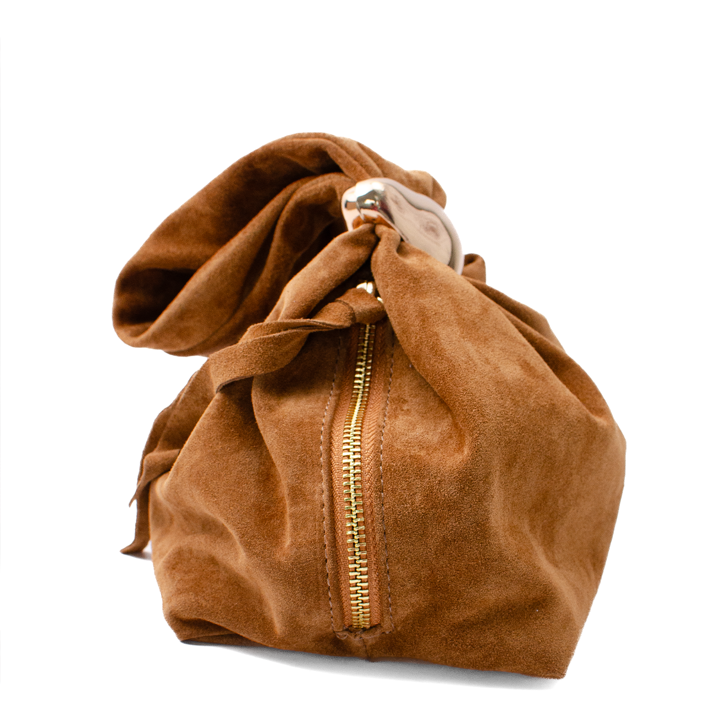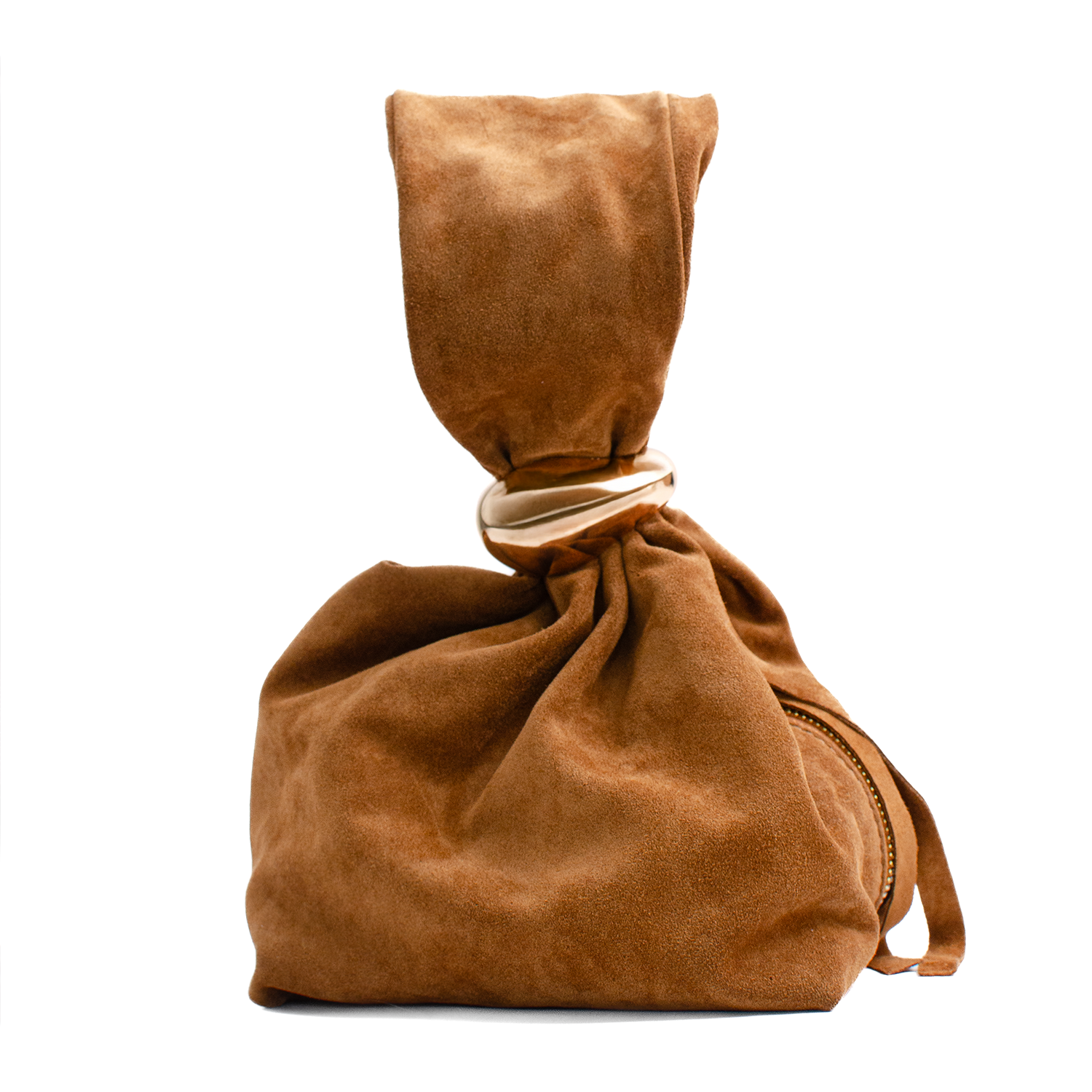 Liten och stilren aftonväska i mjukt, äkta mocka med unik knutdesign och gulddetaljer. Väskan öppnas från sidan med dragkedja och rymmer en iPhone Pro Max. Perfekt accessoar för kvällens alla tillfällen.