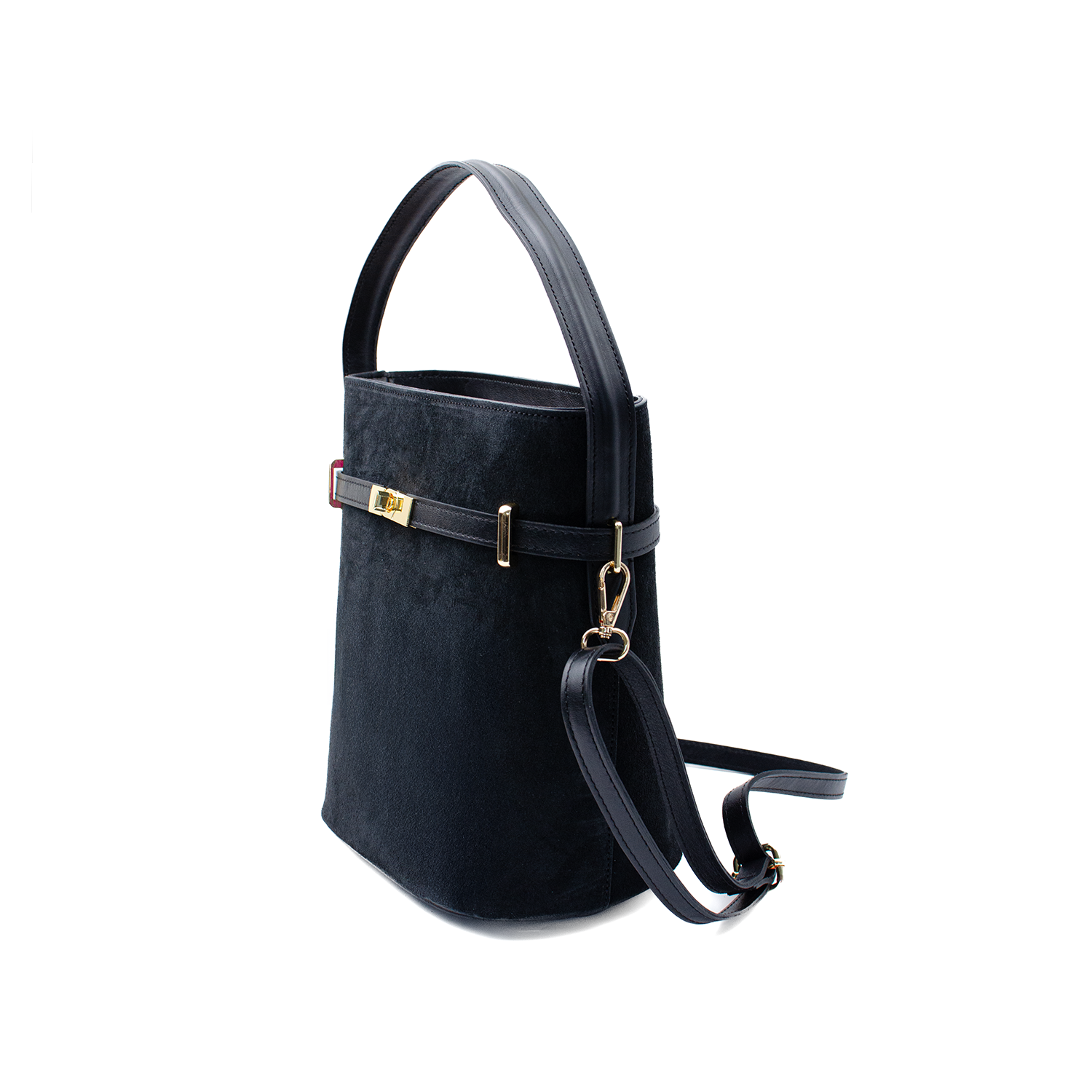 Väskan har ett stilrent bälte runtom, en kort rem för handbärning samt en lång, justerbar rem för axeln eller crossbody. Insidan rymmer ett stort fack med dragkedja samt en mindre ficka med dragkedjestängning.