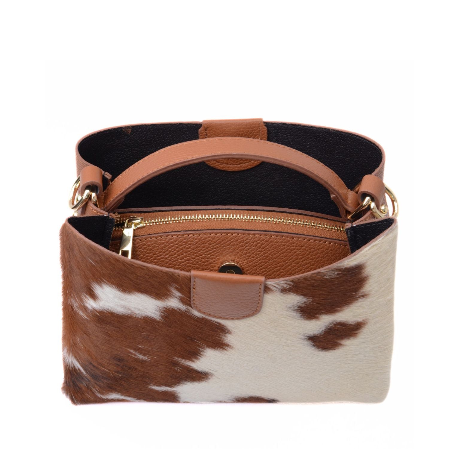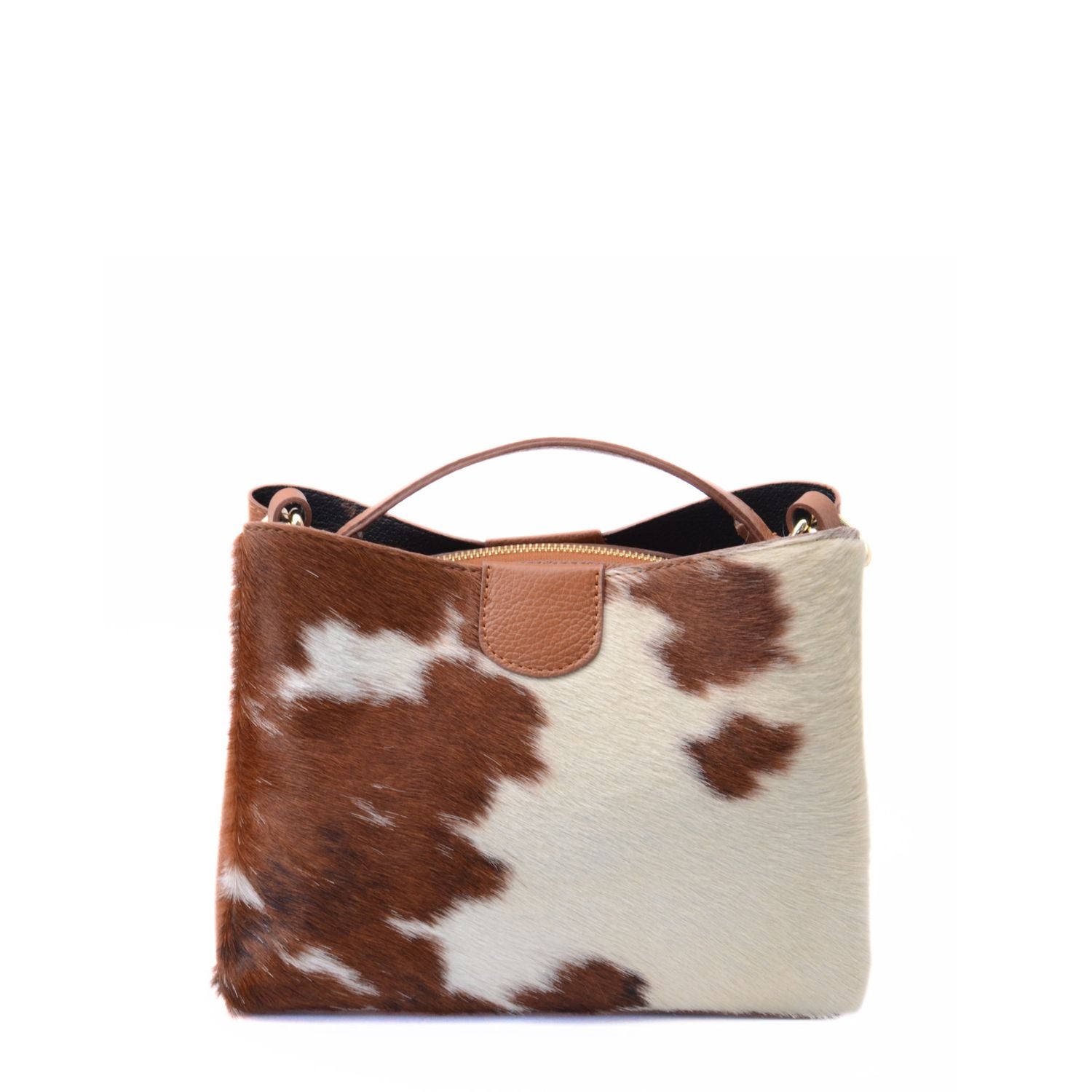 Novaro-väskan från Latalia i präglat läder med kort ko-mönstrad päls framtill är en statement-piece med både elegans och attityd. Baksidan i slätt läder ger extra hållbarhet, medan den lyxiga pälsen framtill tillför en unik touch. Väskan har två rymliga huvudfack, separerade av en praktisk ficka med dragkedja. Bär den i hand med de stilrena handtagen eller använd den avtagbara axelremmen för en mer avslappnad look.